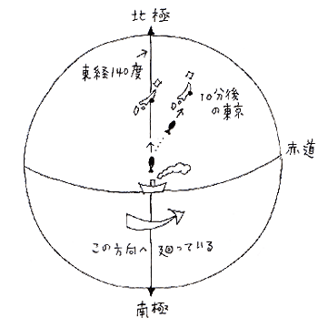 仮に、東経140度の赤道上にいる船から真北の東京へ向かってロケットを発射したとします。地球にいる私たちから見れば、ロケットは140度の経度線上をまっすぐに北に向かって飛ぶように見えますが、宇宙にいる例えばスペースシャトルの野口さんが見ると、ロケットは右にカーブしながら飛んでいるように見えるはずです。これは地球が自転しているために起きるコリオリ力の現象で、風の向きも変えられるようなものすごい力なんです。下の絵を見ると分かるでしょ。