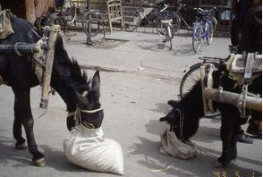 [写真左] ロバは自分で餌を携帯している。 [写真右] 露天のお茶のお碗は共有、そんなことを知らないで